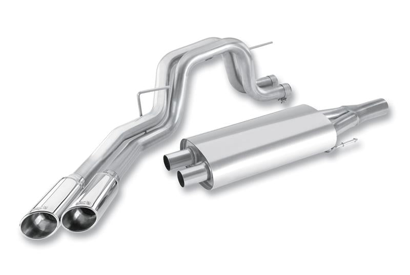 Retains factory front muffler (resonator). From the 35" BF Goodrich tires to the cast aluminum SVT control arms, the Ford Raptor has re-defined off road trucks. All that's missing to complete this street-legal Baja prerunner is a high-flow performance exhaust to unleash the engine's full potential, and who better to supply it than Borla(r) the world's most winning exhaust. Borla(r)'s Cat-Back(tm) exhaust (PN 140383) for the F150 Raptor '10-'14 draws from decades of winning racing experience from the Baja 1000, Best In The Desert, CORR and other top venues, resulting in a world-class off road system. Utilizing Borla(r)'s patented, straight-through Multicore technology, Borla(r) engineers were able to achieve a 13% increase in flow while reducing the overall system weight 18%! And they made it look better too. Gone are the boring factory single wall, unpolished tips. In their place are dual 4" polished T-304 stainless steel tips with handsome rolled edges that enhance the Raptors brutish good looks. High-quality T-304 austenitic stainless steel tubing is mandrel bent by computer-controlled CNC machinery to ensure maximum flow and a perfect fit. And while fit finish are great, it's the trademark Borla(r) sound of power that really captures the essence of this premium exhaust. A hearty rumble rings through every time you get on the throttle, slightly louder than stock with no cabin resonance. Like all Borla(r) street systems, this exhaust is backed by Borla(r)'s famed Million-Mile Warranty. That's 50 years of off-roading 20,000 miles a year! Engineering innovation, high-quality materials and state-of-the-art manufacturing make it easy to see why Borla(r) is THE choice of performance enthusiasts worldwide. For more information on Borla(r) products, visit www.Borla(r)com or call toll-free 1-877-GO Borla(r)
