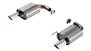 This 2.5" diameter Borla(r) Axle-Back exhaust system is designed to fit the 5.0L Mustang GT that is NOT equipped with Active Exhaust. Muffler contains Polyphonic Harmonizer technology which utilizes patented units that contain pipes of different diameters and lengths to create multiple exhaust notes that harmonize to deliver a clean, rich, full-bodied sound. It features 4" bright chrome on T-304 stainless steel tips and the aggressive ATAK(r) sound level with no drone inside the vehicle. Systems with black chrome on T-304 stainless steel tips, and carbon fiber tips are also available. It fits both the coupe and convertible models. The straight-through and patented multi-core technology is designed to unleash hidden horsepower. Increased exhaust velocity adds power, driving excitement, fuel economy, and the distinctive BORL A Sound of Power respected by motoring enthusiasts everywhere. Each system is built from premium T-304 stainless steel, superior to T-400 series knockoffs (such as 409), to give you the absolute best in performance and durability. Ultra-smooth mandrel bends ensure maximum flow & power, and precision computer numerical control (CNC) manufacturing ensures an accurate fit. Best of all, Borla(r) stands behind every system with a Million-Mile Warranty. Just what you'd expect from the world's most experienced (and most winning) exhaust brand.
